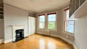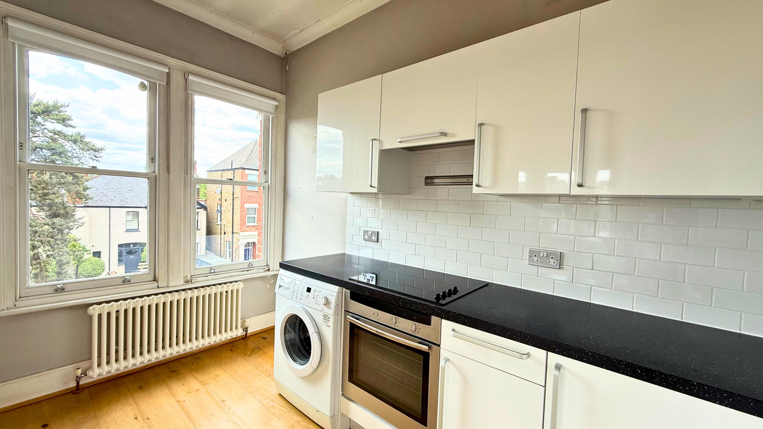 The apartment features high ceilings, large double-glazed sash windows and decorative coving, creating an inviting and airy ambiance. The spacious kitchen and comfortable living area are complemented by eight generous sash windows that fill the space with natural light. The property also benefits from a modern, four-piece bathroom and access to a beautifully maintained communal garden.